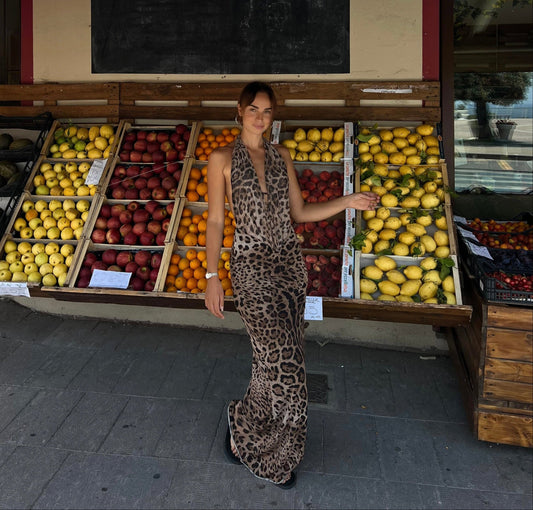 Women's Cocktail Leopard Halter Maxi Dress With Open Back